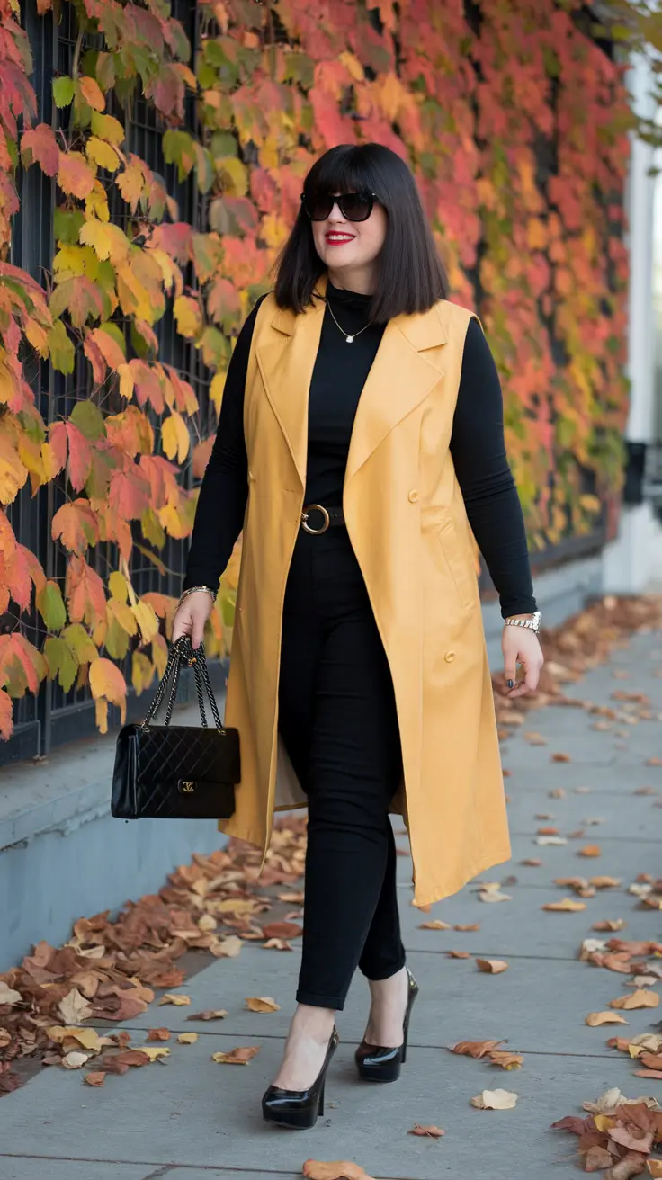 Горчичный удлиненный жилет на элегантной черной основе — это тот сюрприз, о котором вы даже не подозревали. Насыщенный золотистый цвет мгновенно создает осеннее настроение, особенно в сочетании с падающими листьями, а монохромная основа делает образ лаконичным и визуально удлиняет фигуру. Это смелое сочетание, которое можно носить как на улицах города, так и в более изысканных ситуациях, например на ужине.