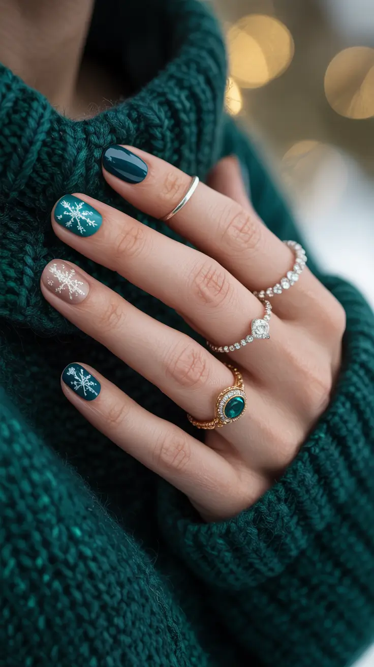 Чтобы добиться такого эффекта, я наношу Essie Blanc, чтобы нарисовать снежинки тонкой кистью для ногтей поверх Stay Off the Lawn! от OPI, и получаю изумрудно-бирюзовую основу и ручную роспись! Слабый блеск на голой нижней части можно воспроизвести с помощью прозрачного верхнего покрытия Zoya Sparkle.