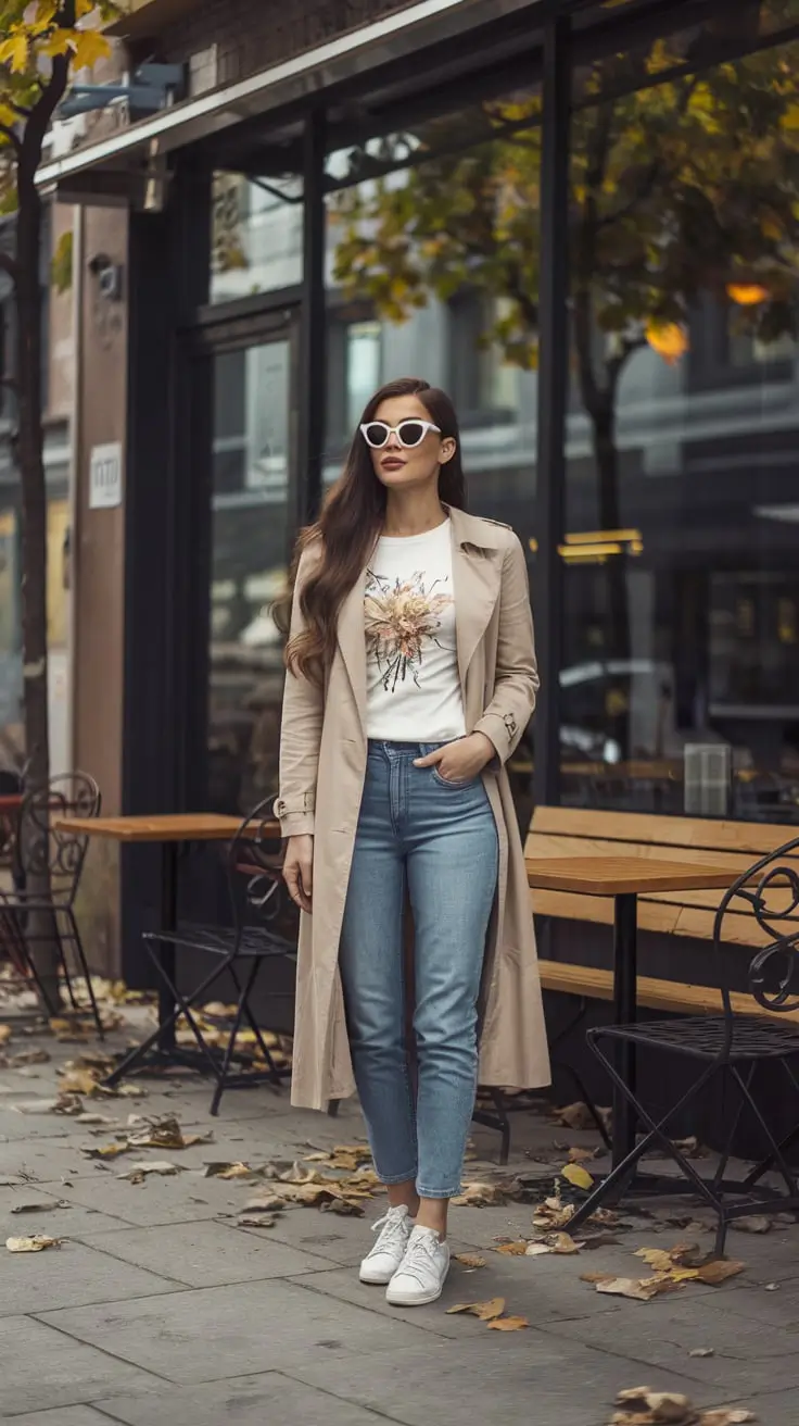 Что мне нравится в этом повседневном наряде, так это его универсальность. Тренч — это, по сути, супергерой в шкафу: он подходит для осени, весны и даже для тёплых непредсказуемых летних вечеров. Мне нравится, как он сочетается со светлыми джинсами и кроссовками, создавая непринуждённый образ, а футболка с цветочным принтом придаёт ему изюминку, не позволяя выглядеть скучно. Пара солнцезащитных очков в стиле ретро объединяет всё воедино, сочетая очарование старой школы с современным стилем.