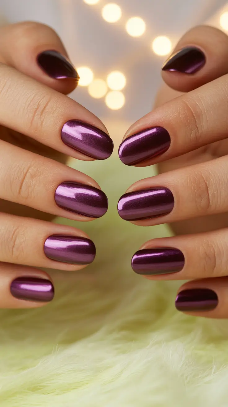 В металлических сливовых ногтях есть что-то такое, перед чем невозможно устоять. Они наполнены зимними ягодами и таинственностью полуночного неба — они мгновенно придают уверенности. Мне всегда нравилось, как этот цвет меняется в зависимости от освещения: иногда он тёмный и драматичный, иногда тёплый, как аметист. Он идеально подходит для расслабляющих вечеров, когда хочется, чтобы ногти касались чашки с горячим какао, как маленькие драгоценности.