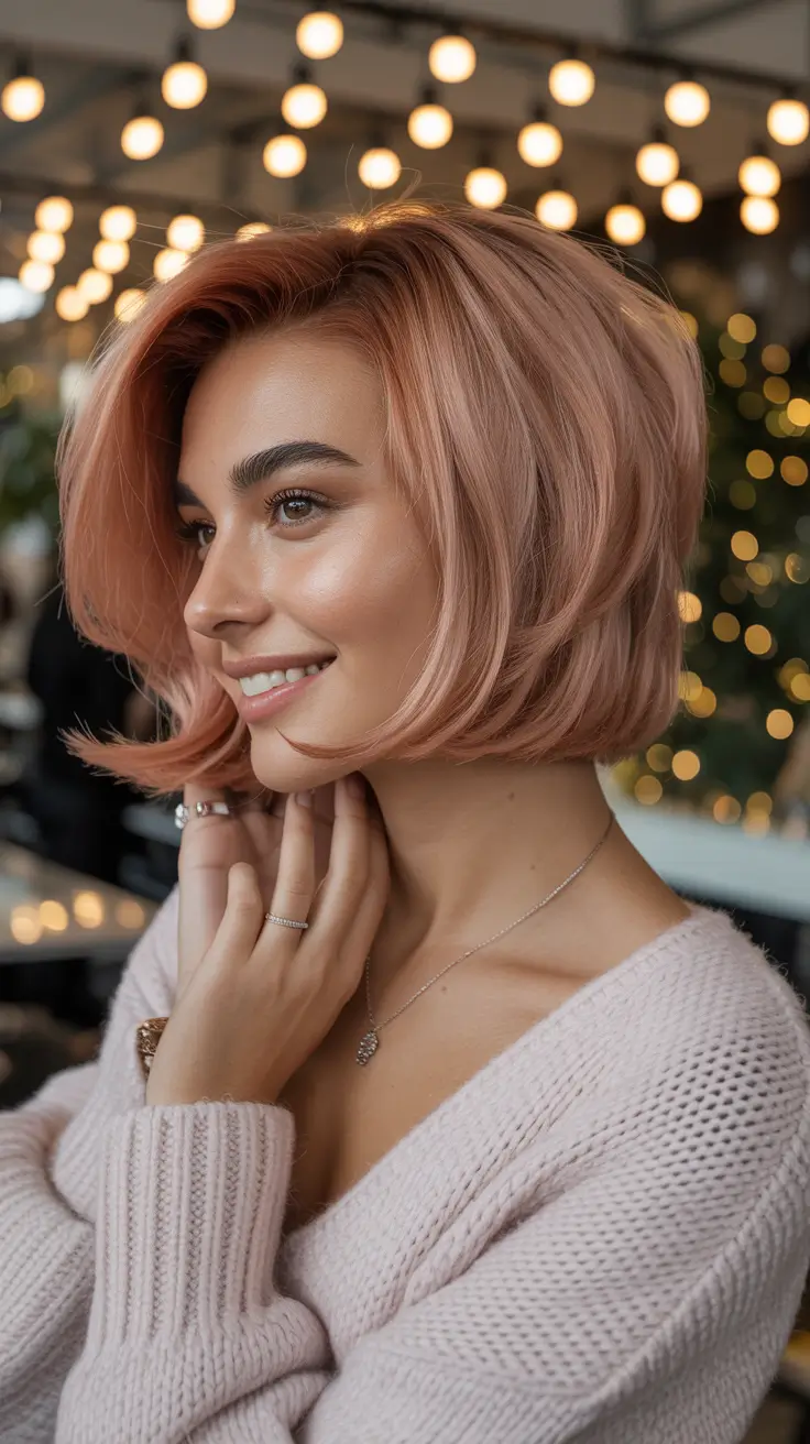 Боб с розовым оттенком — это идеальный вариант между чем-то весёлым и чем-то стильным. Стрижка короткая, с мягкими слоями, а приглушённый розовый оттенок очень тёплый и освежает в холодное время года. Это не ярко-розовый и не слишком пастельный оттенок, а скорее естественный тон, который удивительно хорошо подходит для зимы.