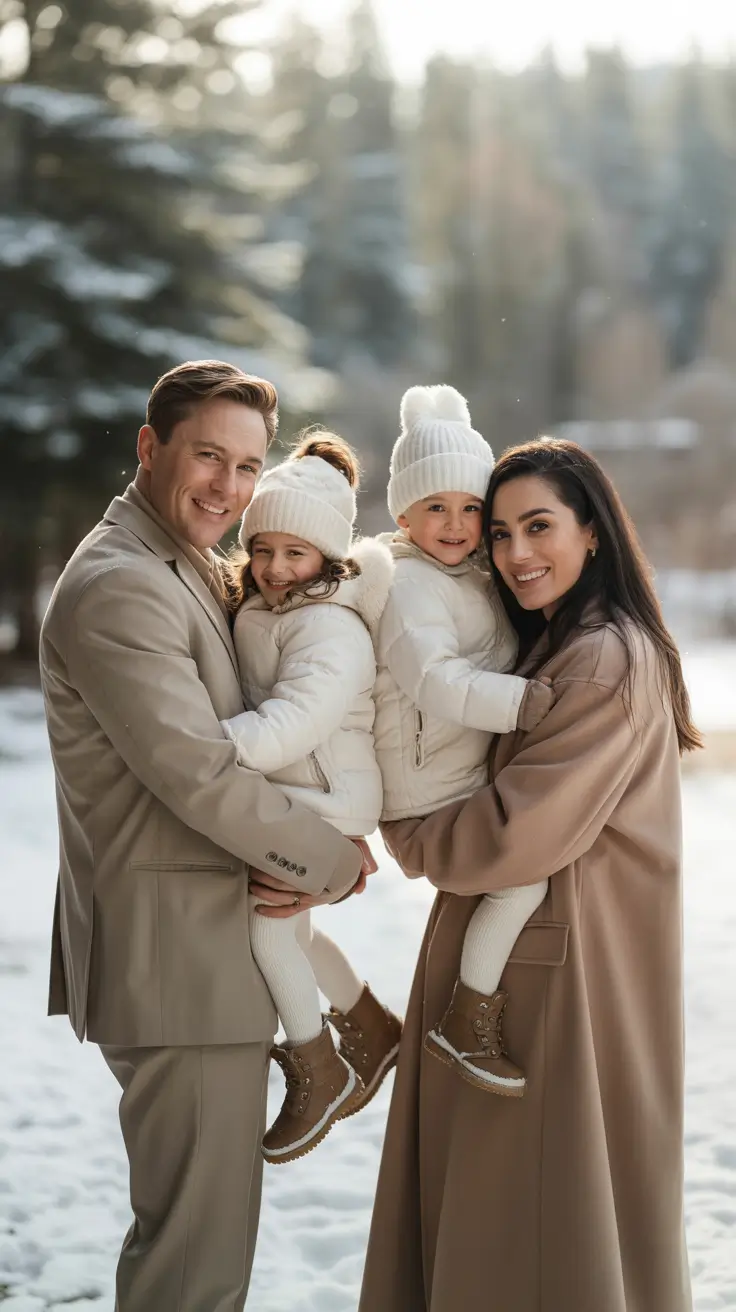У него структурированное пальто, а у неё — длинное, и то, и другое — чистое и современное. Пуховики на детях делают образ практичным, но сочетание белого с белым выглядит скорее нарочито, чем утилитарно. Добавьте тёплую зимнюю обувь, и вы получите наряд, который будет удобен в снегу и презентабелен перед камерой.