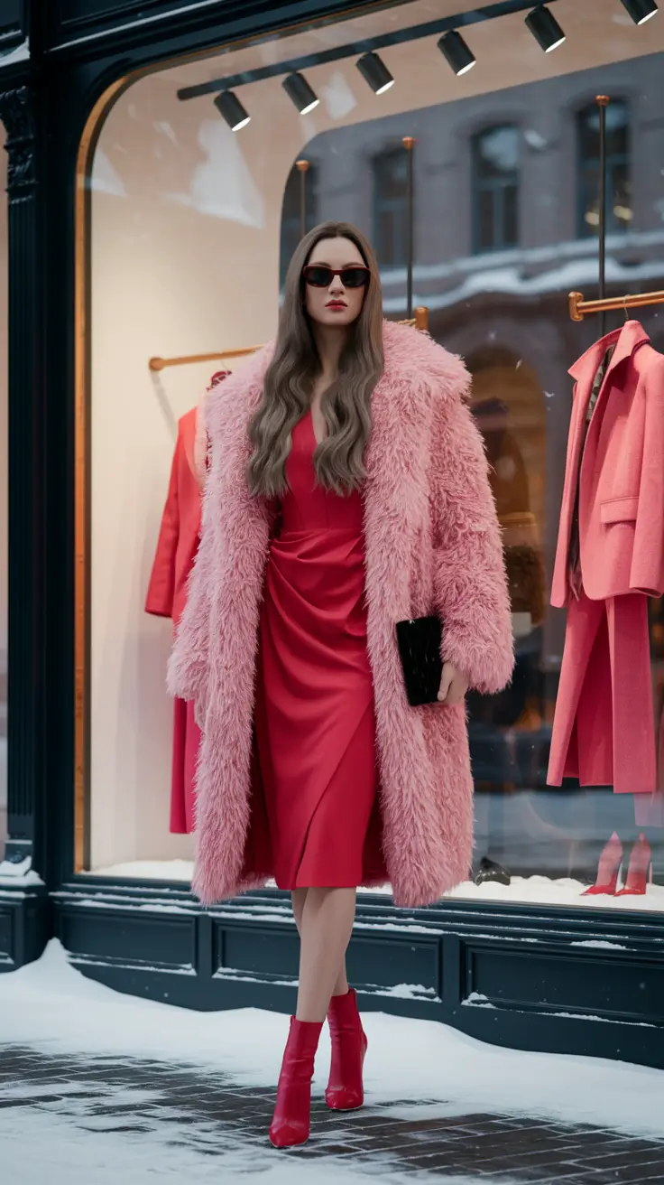 Эта фраза застает всех врасплох, и этот взгляд доказывает, что зимняя одежда не обязательно должна быть скучной. Эффектное сочетание дорогого красного платья с пышным розовым пальто из искусственного меха задает уверенный тон. Гладкие красные ботильоны и блестящие солнцезащитные очки придают образу драматичность и в то же время комфорт. Весь наряд словно говорит: «Да, мне тепло, и меня не остановить».