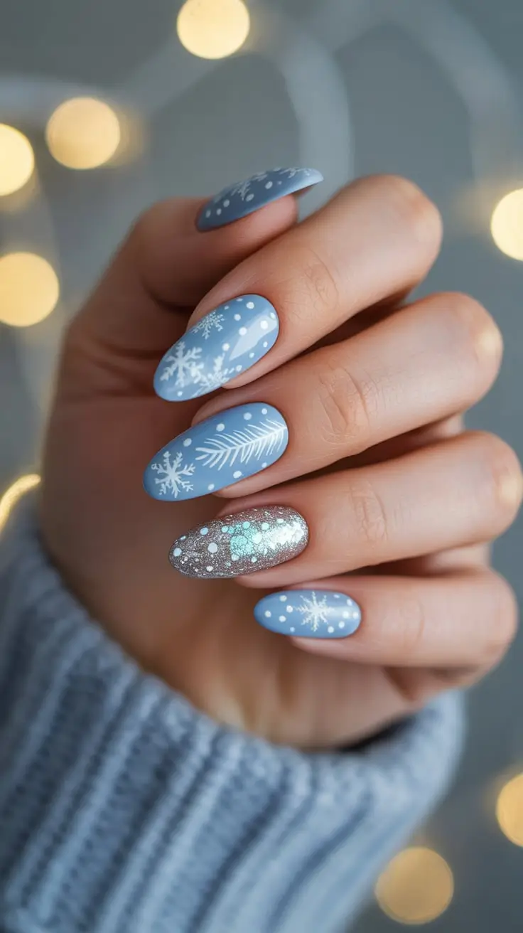 В этом пудровом небесно-голубом гелевом маникюре есть что-то сказочное, особенно в сочетании со снежинками и лёгким серебристым мерцанием. Мне всегда нравилось, как этот дизайн передаёт спокойствие времени года — как будто ты держишь в руках снежный шар. Матовая текстура согревает, как кашемир, а акцентный ноготь с блёстками добавляет искорок морозным утром или в разгар вечеринки.