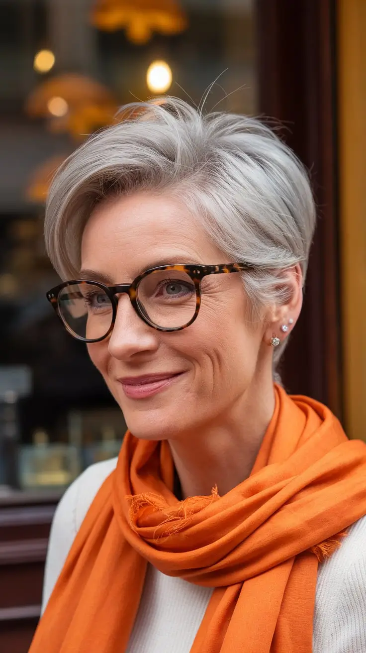 Эта стрижка пикси с многослойностью и мягкой чёлкой, зачёсанной набок, выглядит очень индивидуально. Благодаря этой стрижке серебристые волосы выглядят молодыми и энергичными, а более длинные передние пряди универсальны: их можно зачёсывать назад, набок или оставлять распущенными.