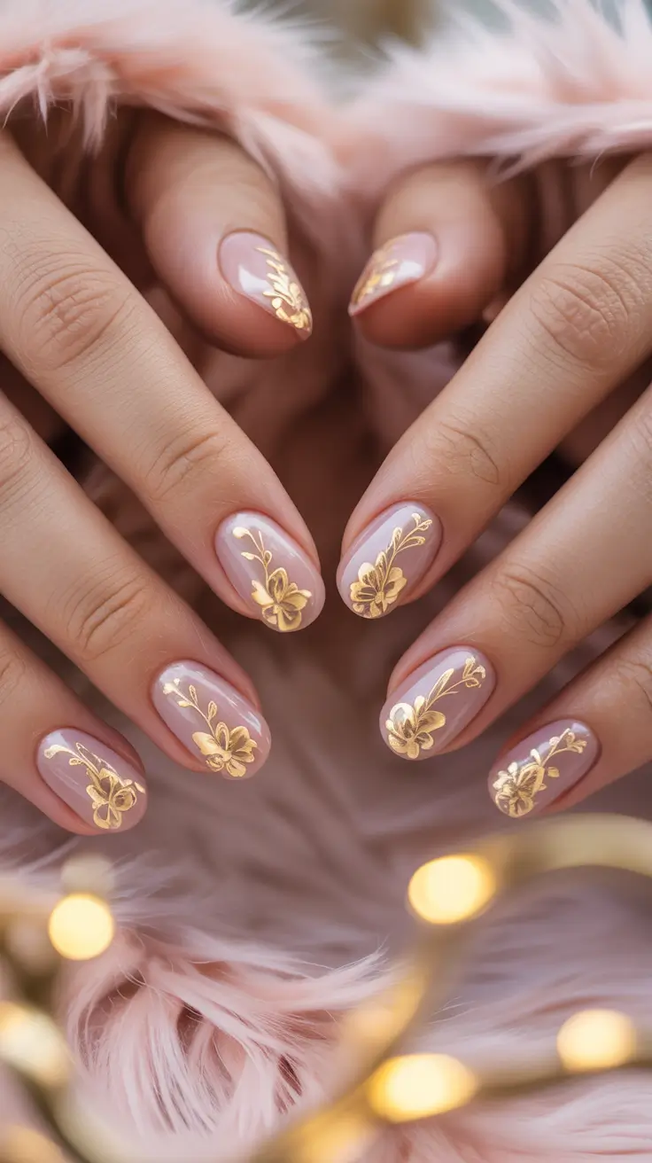 Это просто радость. Бледно-розовые ногти с золотыми сердечками, мелкими металлическими точками и игривыми абстрактными акцентами — романтично, празднично и совершенно неотразимо зимой. Сочетание нежно-розовых и золотых деталей напоминает вечеринку в элегантной вуали.