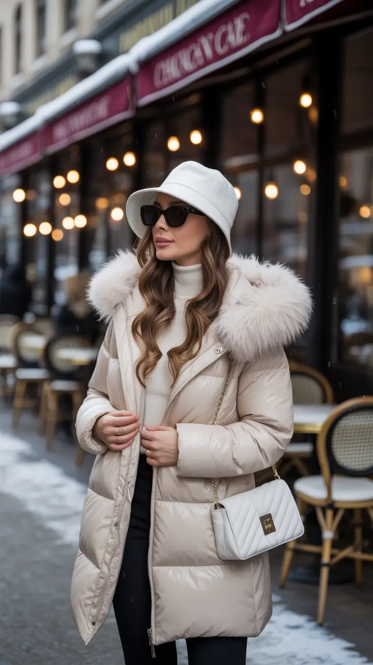 Что-то такое мягкое в кремово-бежевом пуховике и гладких черных брюках. Мне нравится, как высокий воротник и меховая отделка пуховика создают баланс между теплом и элегантностью — это почти как объятия, но при этом достаточно нарядно, чтобы носить такое на Пятой авеню. Белая шапка-ведро придает образу современный вид, но при этом не делает его старомодным. Это простой, но очень выразительный рецепт: приглушенные цвета, классический крой и аксессуары, которые не кричат, а шепчут.