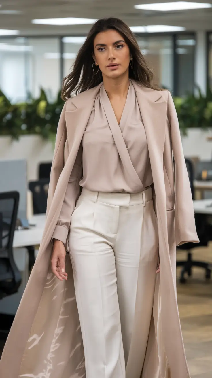 Каждый предмет в этом образе имеет право на место в гардеробе. Брюки с высокой талией визуально удлиняют ноги, блузка делает образ более плавным, а пальто объединяет всё это, словно модный восклицательный знак. Такой образ можно составить из базовых вещей, то есть вы не пытаетесь угнаться за трендами, а создаёте долговечный образ.