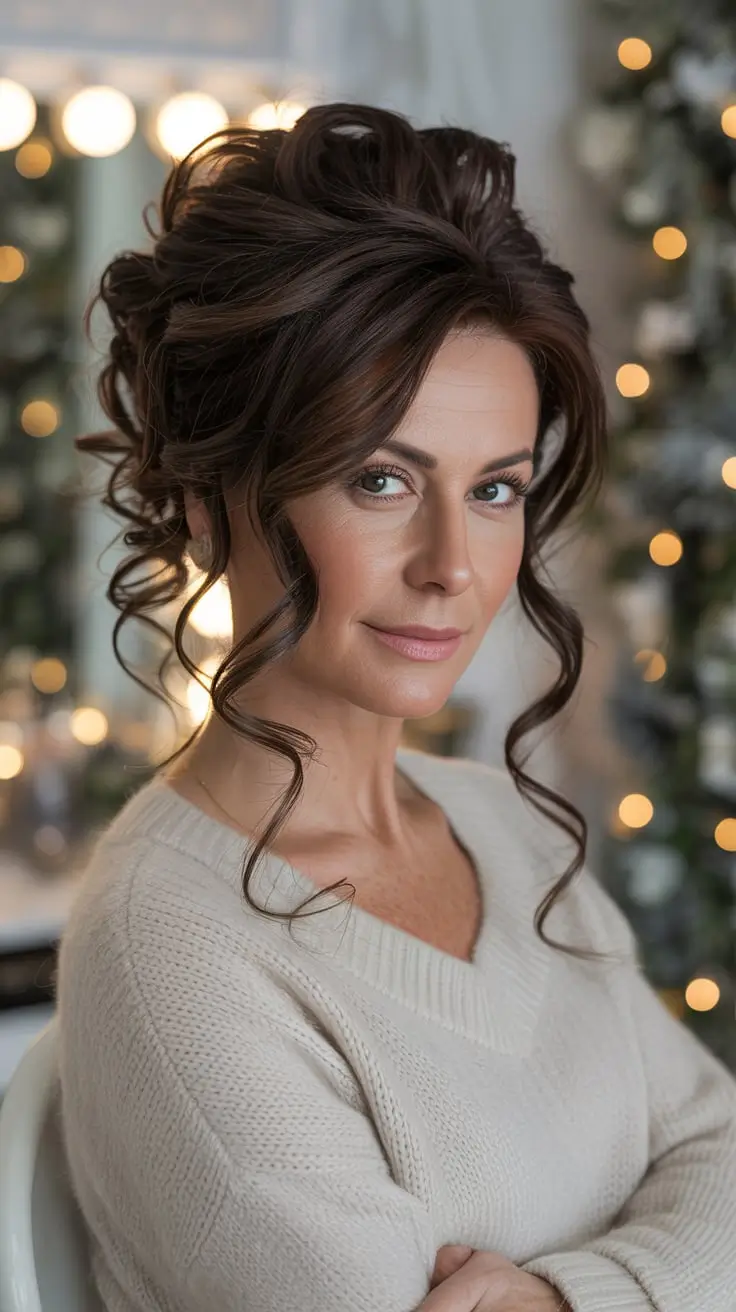 Причёска выглядит молодо, но элегантно, а верхний узел аккуратно прикрыт мягкими слоями, ниспадающими на лицо. Карамельный цвет на более тёмной основе придаёт причёске теплоту и отражает свет в праздничном стиле, который нравится женщинам старше 50 лет. Это одна из зимних причёсок, которая выглядит молодо, но не перегружена деталями.