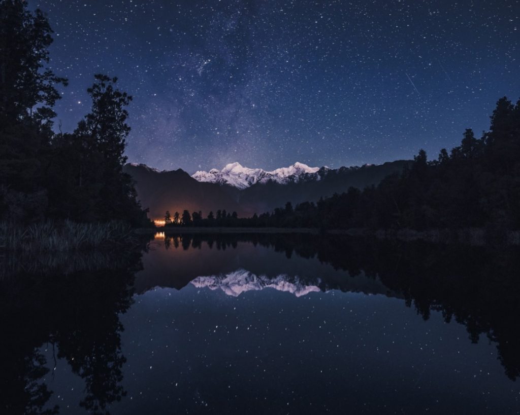 Если в кадр попадают огни города и звёздное небо, нужно тщательно проработать экспозицию, чтобы искусственная иллюминация не “съедала” звёзды и рисунок облаков.
