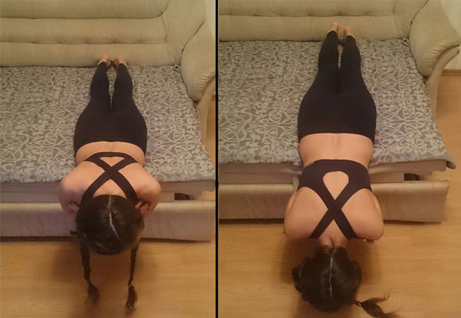 - Ложимся животом на раздвинутый диван ногами к стене, верхняя часть тела выходит за пределы дивана (положение напоминает гиперэкстензию), руки сцепляем за головой и начинаем опускать и поднимать корпус