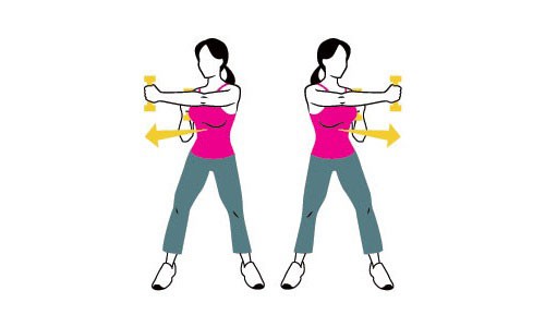 - Есть второй вариант упражнения: положение аналогичное, только руки сцепляем не за головой, а держим их по сторонам с гантелями и выполняем махи руками как можно сильнее, прижимая лопатки друг к другу.