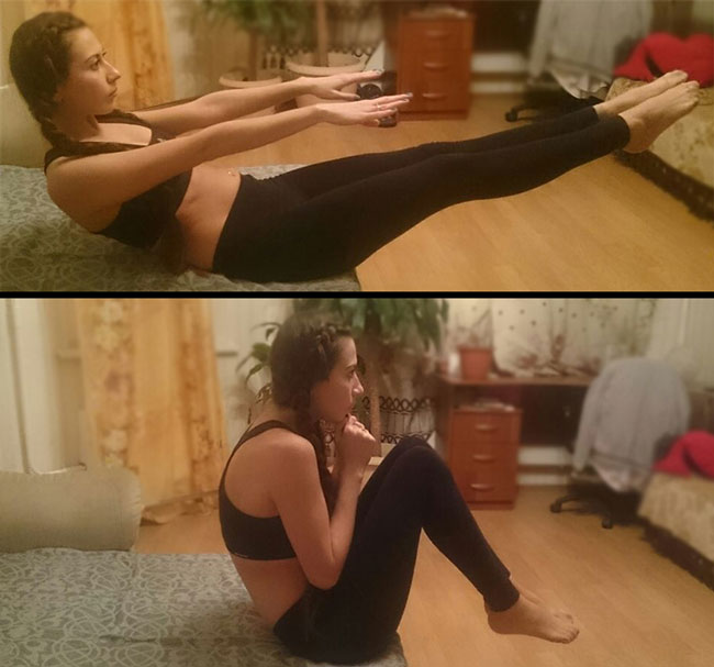 - Второй вариант упражнения для пресса на диване: ложимся спиной на диван, ноги ровные, в руки берем любое утяжеление (гантели, бутылку с водой и т. п.), затем приподнимаем спину от дивана (руки с утяжелением держим на уровне груди), как можно сильнее напрягаем область живота и задерживаемся в таком положении на 30 секунд. Повторяем не менее 10-15 раз.