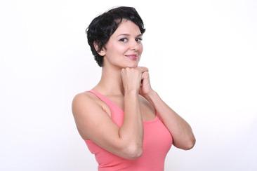 8. Руки, соединенные в пальцах, подведи под подбородок. Надави подбородком на руки 3 раза по 7 секунд.