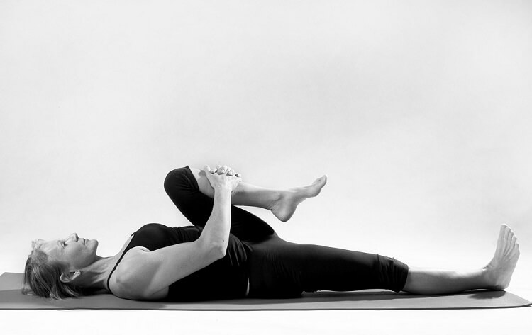 Лежа на спине, прижмите одно колено к груди, а другую ногу держите прямо. Сделайте несколько глубоких вдохов. Следите, чтобы плечи были на полу. Повторите по 30 секунд для каждой ноги.