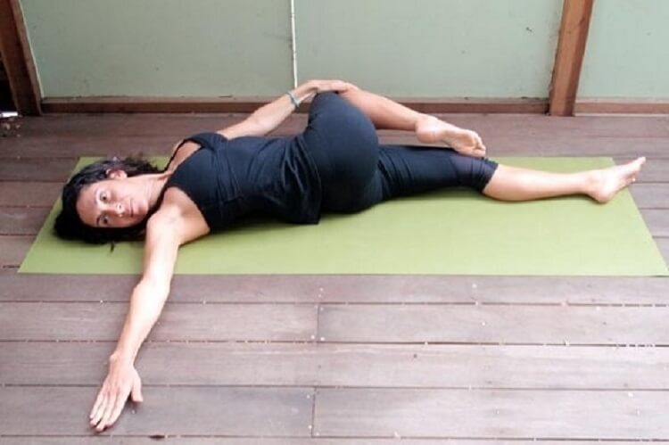 Лягте на спину и сформируйте телом букву Т (ноги вместе, руки в стороны). Держа одну ногу прямой, согните другое колено под углом 90°, поставьте противоположную руку на колено. Повернитесь лицом к вытянутой руке. Оба плеча должны быть прижаты к полу. Дышите глубоко и свободно, уделяйте по одной минуте на каждую сторону.