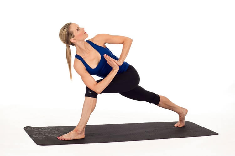 Встаньте прямо и сделайте шаг вперед правой ногой, согнув ее в колене. Левая нога прямая. Поворачивая корпус в сторону согнутой ноги, соедините ладони и поставьте руки так, чтобы локоть находился с внешней стороны согнутого колена. Постарайтесь удержаться в такой позе 30 секунд.