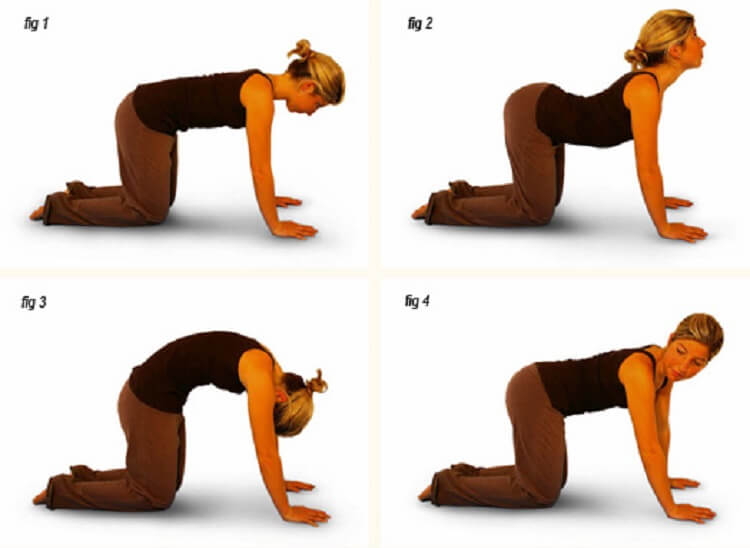 Станьте на колени, ладони прижмите к полу. Выгните спину и поднимите грудь. Почувствуйте, как растягиваются плечевые мышцы. Дышите спокойно и ровно около 10 секунд. Затем выгните спину дугой, прижимая подбородок к грудной клетке. Снова задержитесь на 10 секунд и вернитесь в исходное положение. Делайте упражнение одну-две минуты.