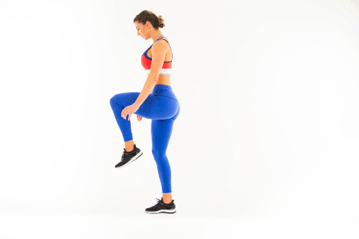 Станьте в планку на прямых руках, одну ногу согните в колене, держите ее под углом 90 градусов, затем поднимайте ее вверх и опускайте. Просто повторите за девушкой на фото.