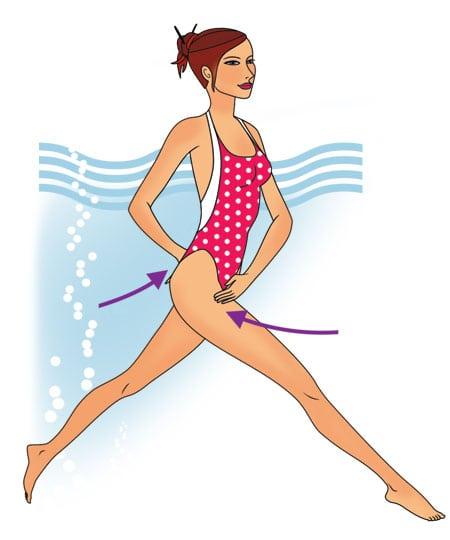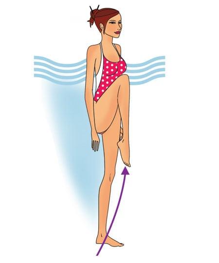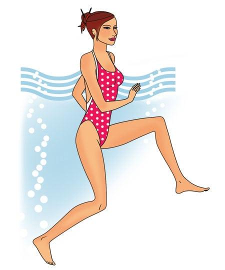 Бег на месте. Ходьба и бег в воде помогают проработать не только ноги и попу, но и пресс. Также к упражнению можно присоединить махи руками, и получится комплекс для всего тела.