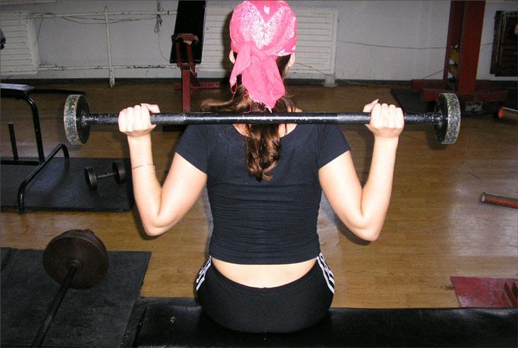 Сесть можно на скамейку без спинки или использовать скамью со спинкой, отклоненной от вертикали на 10-15 градусов. В первом случае активнее будут работать мышцы пресса. Штангу лучше расположить на стойках на такой высоте, чтобы в исходном положении можно было поднять ее на вытянутые руки.