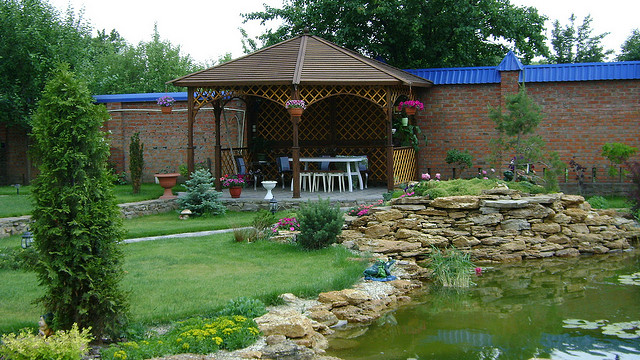 Очень красиво в саду смотрятся каменные беседки. А беседки из кованого железа уже сами по себе являются предметом искусства и удовлетворят любой эстетический вкус. Только надо иметь в виду, что железо и растения «не дружат». В морозы вьющиеся растения могут просто погибнуть рядом с холодным металлом, разве что для клематиса это нестрашно: каждую весну он заново отрастает.