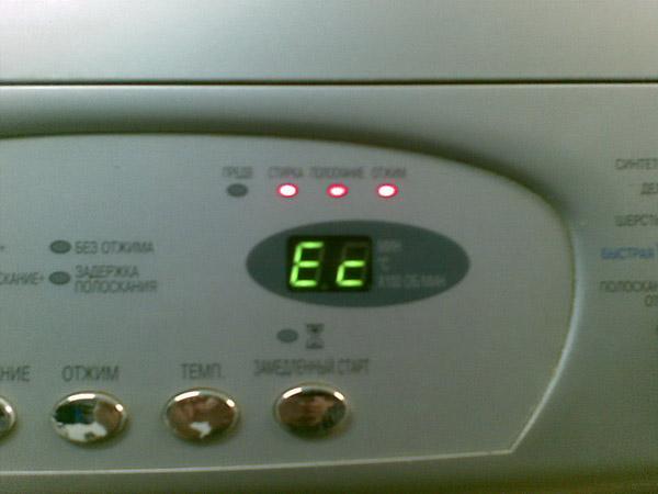 Е04 — Переполнение рабочего бака: в этом случае СМ автоматически прерывает стирку и включает сливной насос. Люк остаётся заблокированным до полного выключения машины.