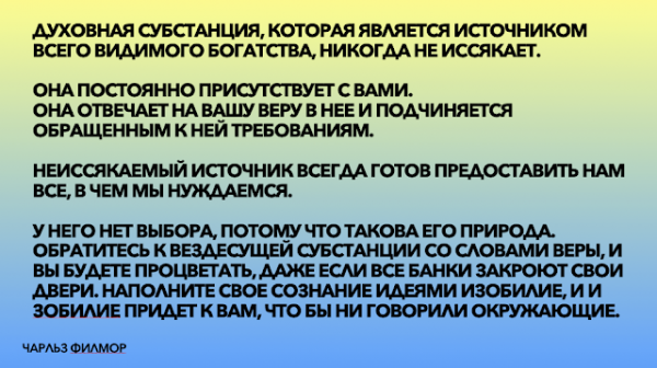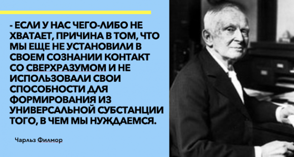 Таким образом Чарльз Филмор косвенно доказал, что нас окружает невидимая разумная субстанция, которая преобразуется от наших мыслей, слов и поступков.