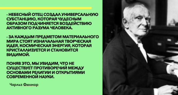 Таким образом Чарльз Филмор косвенно доказал, что нас окружает невидимая разумная субстанция, которая преобразуется от наших мыслей, слов и поступков.