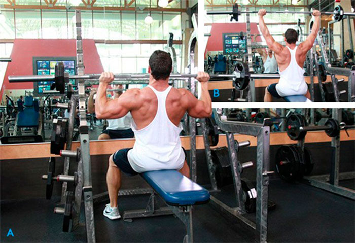 Нагружает в основном средние пучки дельтовидных мышц и верхнюю часть трапецевидных мышц, а также трицепсы и переднюю зубчатую мышцу.