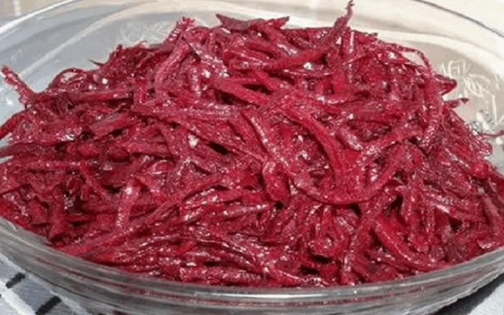 Сырую свеклу натереть на тёрке, немножко посолить и добавить уксус. Оставить мариноваться на 2 – 3 часа. после чего появившееся сок слить. Лук поджарить на растительном масле до тёмно-золотистого цвета и вытащить со сковороды ( он нам больше не нужен).