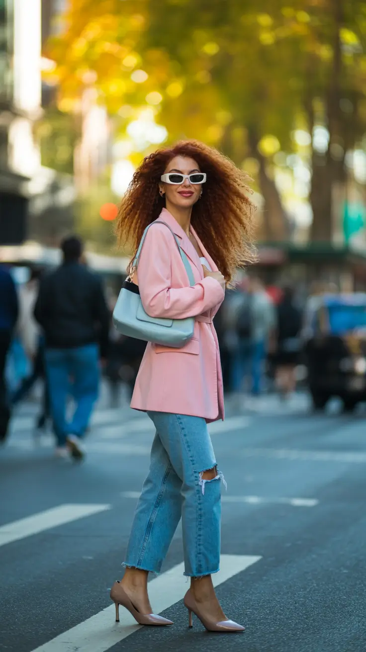 Это урок бесстрашного стиля: ярко-розовый блейзер поверх бирюзового укороченного топа и разноцветные брюки с геометрическим принтом. Добавьте пушистую сумочку цвета румян и кроссовки, и вы получите жизнерадостный, актуальный образ, достойный Instagram. Осень 2025 года напоминает нам, что веселье — это часть моды.