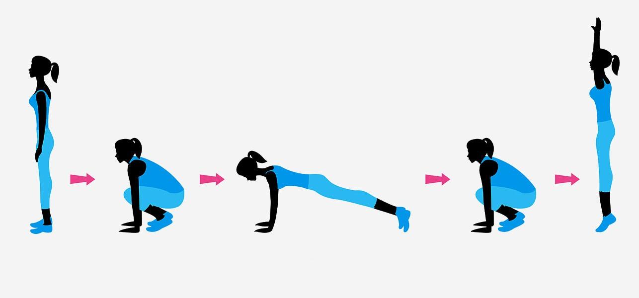 Одно из тех упражнений, которые почти всегда включают в программы Худеем Дома. Присядьте, руки стоят на полу. Перенесите вес на руки, и отпрыгните ногами назад, как бы становясь в планку. Следующий прыжок – обратно, подтягиваем ноги и выходим в присед. Если после этого вы будете выпрыгивать, прогибаясь в спине, получится полноценное движение бурпи (берпи) – очень интенсивная жиросжигающая тренировка.