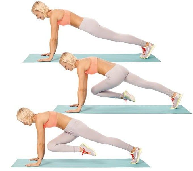 Упор лежа. Выполняем отжимания, подтягивая ногу коленом под живот, и касаясь ее локтем другой руки. Сначала сложно, потом привыкнете. Просто супер для похудения, работают все группы мышц. Когда станет слишком легко, вытягивайте руку вперед, имитируя движение скалолаза, лезущего вверх. Чем более быстрая смена движений – тем скорее будет результат.