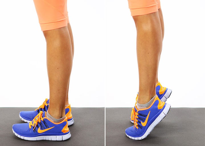 - Теперь поднимайтесь «на цыпочки», а потом опускайтесь вниз, растягивая голеностоп до предела, прикасаясь пятками к полу.