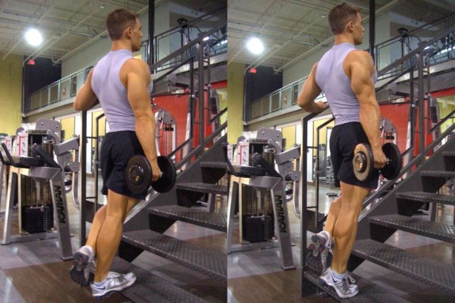 Мужской вариант подъёма с использованием платформы: поднимайтесь с максимальной амплитудой, держа в одной руке гантель, а другой рукой опираясь обо что-нибудь для равновесия.