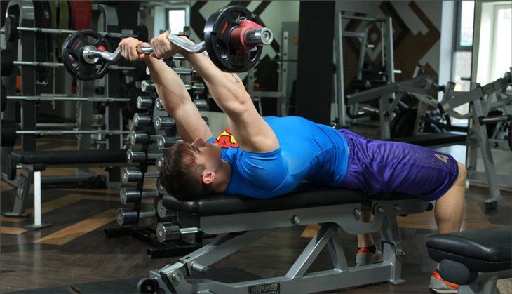 Когда вы выполняете французский жим уверенно лежите на скамье, сохраняя позвоночник в нейтральном положении. Лучше использовать изогнутый гриф, он удобнее для кистей. Наши руки от плечевого сустава до локтя должны быть неподвижны и перпендикулярны полу. А вот предплечья напротив сгибаются и разгибаются в локтях.