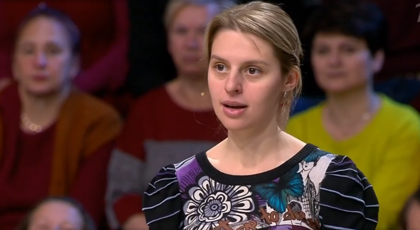 Несмотря на ехидные замечания Александра Васильева, хочу заметить, что бежевый тотал-лук получился вполне гармоничным и современным. Такой комплект пригодится Валерии в повседневной жизни молодой мамы, его нужно только немного доработать. Длинный кардиган следует заправить за пояс, тогда у силуэта появятся изящные изгибы. Талию можно подчеркнуть контрастным поясом – я бы выбрала красный. Осталось добавить рюкзачок ему в тон и накинуть на плечи просторную косуху.
