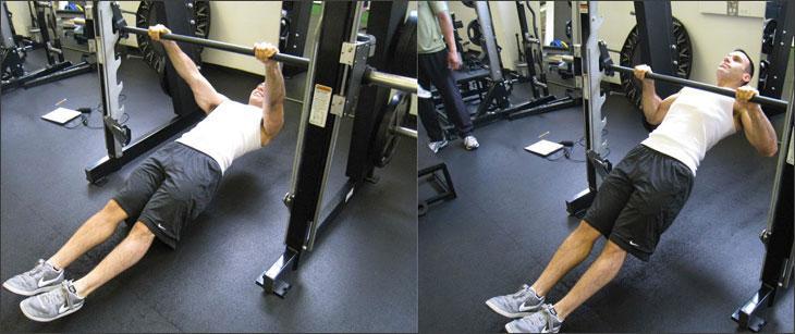 На втором этапе включите в комплекс австралийские подтягивания. Выполнять упражнение можно по программе «Подтягивания за 30 недель».