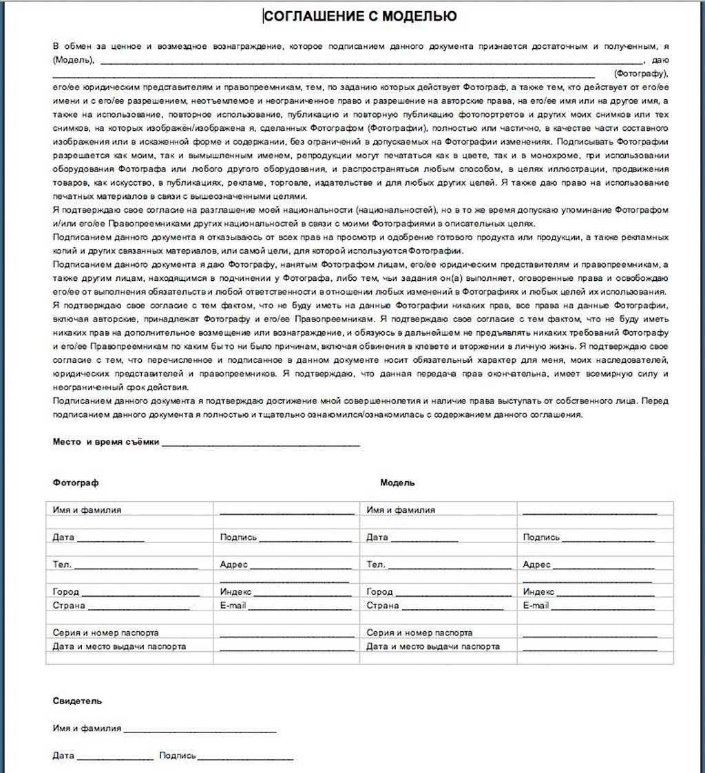 Обязательный момент в ТФП. Все участники должны подписать модель-релиз на использование отснятых фото. В этом документе идет речь о передаче прав на снимки фотографу и дальнейшем их использовании на его усмотрение.