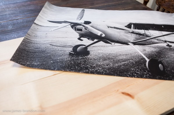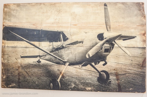 Очевидно, что сначала нужно решить, что именно вы хотите перенести на дерево. Чаще всего яркие, четкие фотографии с высоким разрешением не будут выглядеть слишком стильно на дереве. В нашем случае, такая фотография самолета была обработана в Lightroom чтобы придать ей винтажный вид – переведена в монохром, был усилен контраст и добавлено пленочное зерно.