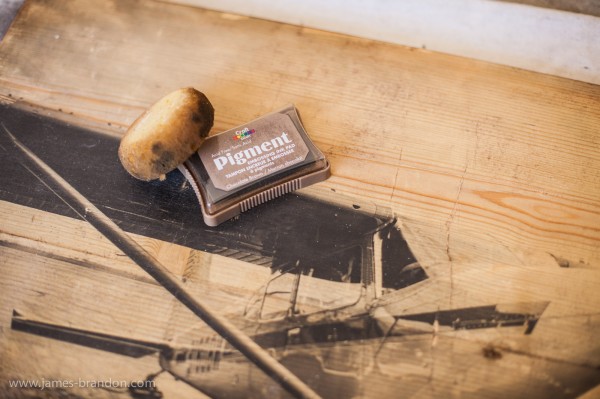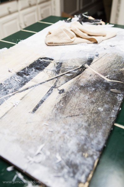 Это очень занятный этап. Чтобы удалить бумагу, нам нужно всего лишь намочить ее и оттереть с помощью рук. Это довольно грязный процесс и возможно существует другой способ, но нам пальцы показались самым подходящим инструментом. Некоторые части изображения будут удаляться легче, чем другие, но имейте ввиду, что к концу процедуры руки и пальцы у вас обязательно устанут. Возможно, процедуру придется повторить и в общей сложность все это займет от до 30 минут. Но этот крайне захватывающий момент – видеть как фотография проявляется уже на дереве. Приготовьте пылесос, чтобы убрать беспорядок, который точно появится после этого шага.