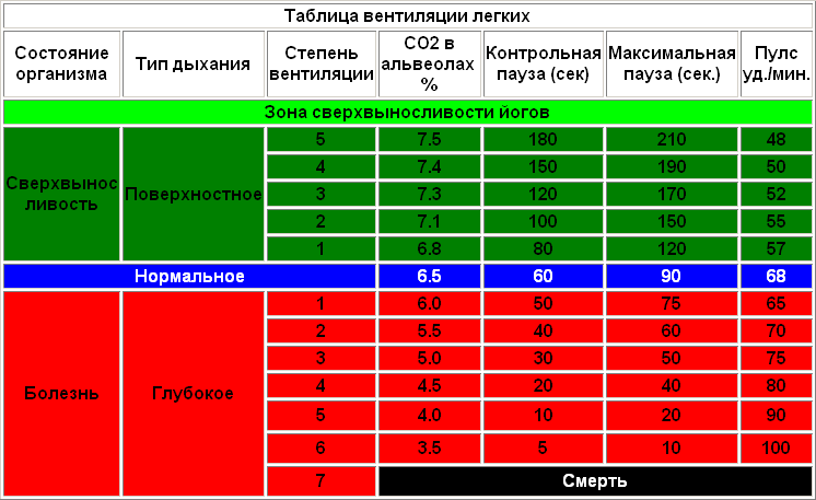 Как видно из таблицы смерть наступает, когда концентрация углекислоты в организме менее 3.5 %. Нормальный здоровый человек имеет контрольную паузу 60 сек. что соотв. 6.5 % СО2. Как известно йоги могут производить задержку дыхания на десятки минут. Зона сверхвыносливости йогов лежит выше КП. 180 сек.