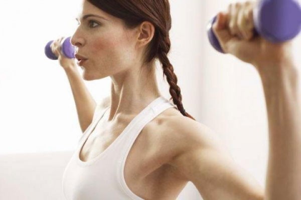 Например, жим гантелей — вдох на сгибании рук в локтевых суставах, гантели опускаете вниз. Выдох — жим гантелей вверх.