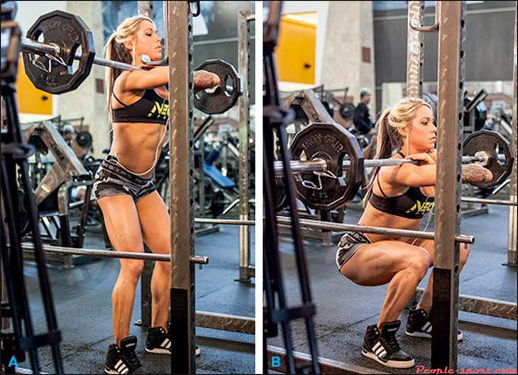Используя в качестве отягощения гантели, штангу или тренажер Смита. Выполнить вам нужно 2-3 сета по 12-20 повторений.