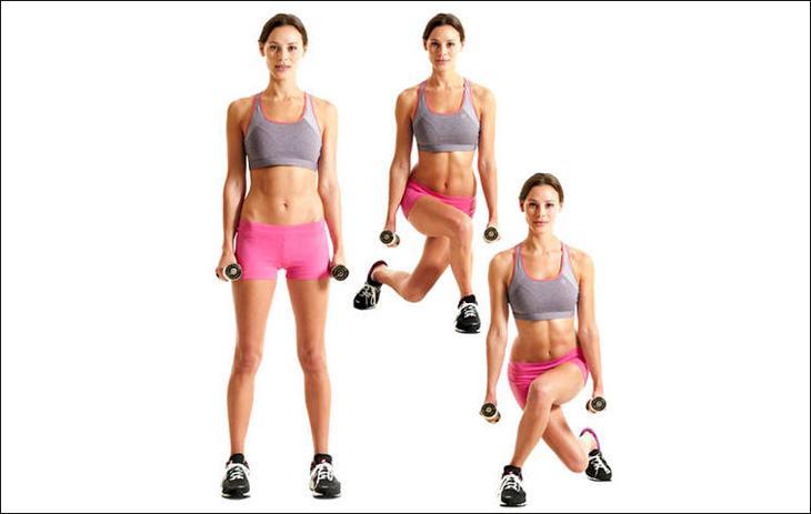 Но делать мы их будем в несколько нестандартной манере. Выпады удобнее всего выполнять с гантелями, так как в таком случае центр тяжести опускается вниз, и мы имеем более устойчивое положение тела.