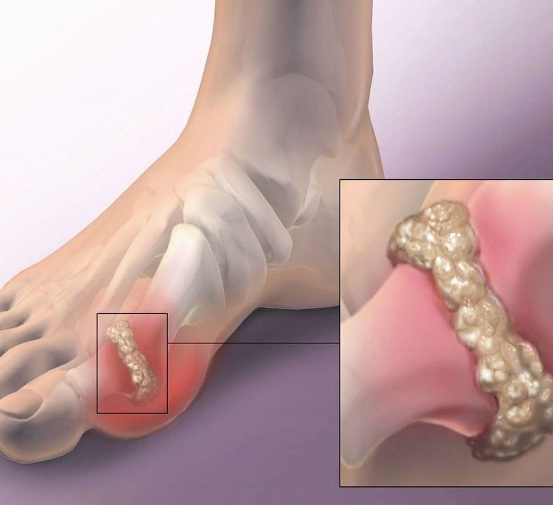 В ходе реакции распада пуринов образуется мочевая кислота. Это химическое соединение транспортируется в кровоток, разносится по организмы и аккумулируется в суставах. Данный процесс вызывает воспаление, что приводит к дискомфорту и болевым ощущениям.