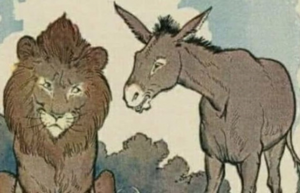 Вспыхнул спор, и они пошли ко льву, лесному царю, чтобы разрешить свои разногласия. Еще до того, как они добрались до места в лесу, где лев сидел на своем троне, ослик начал кричать: