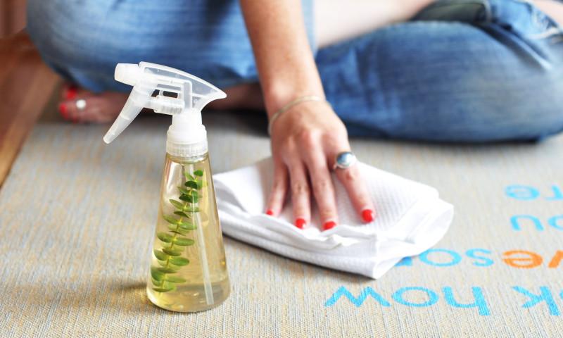 — Если вы сильно вспотели в ходе своей практики, то прежде чем сворачивать коврик, нужно обработать его специальным антибактериальным раствором, дать ему возможность высохнуть и только затем сворачивать — так он не впитает запахов. Вот, например, какие есть чудесные натуральные средства для обработки коврика.