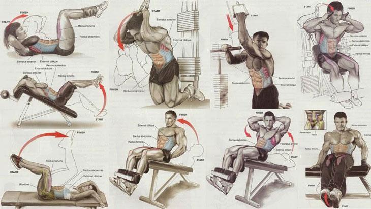 - Скручивания. Выполняются скручивания как на полу, так и на специальной скамье.